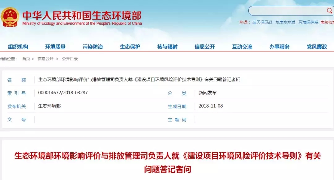 生態(tài)環(huán)境部日前印發(fā)了《建設(shè)項(xiàng)目環(huán)境風(fēng)險(xiǎn)評(píng)價(jià)技術(shù)導(dǎo)則》(HJ169-2018)(以下簡稱《風(fēng)險(xiǎn)導(dǎo)則》),生態(tài)環(huán)境部環(huán)境影響評(píng)價(jià)與排放管理司負(fù)責(zé)人就《風(fēng)險(xiǎn)導(dǎo)則》修訂的背景、思路及內(nèi)容等有關(guān)問題回答了記者的提問。